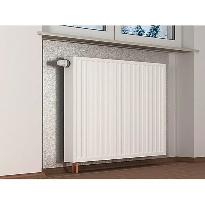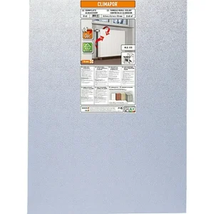 Climapor izolacijska ploča s aluminijskom oblogom idealna je za odvajanje toplih i hladnih područja. Izrađena je od ekstrudiranog polistirena koji ima odlična toplinsko-izolacijska svojstva.Izolacijska ploča s aluminijskom oblogom pokriva pukotine i neravnine zidova, efektivno štiti od nastanka vlažnih zidova i ne dopušta nastanak plijesni te pomaže bržem zagrijavanju prostora. Koristi se iza radijatora gdje može reflektirati toplinu iz radijatora u prostor i do 95 %. Ploču možete koristiti između pećnica i hladnjaka.Ova ploča smanjuje gubitak topline kroz zid do čak 36 %. U odnosu na neizolirani zid, 10 mm ploča ima isti izolacijski učinak kao 200 mm pune cigle tj. 429 mm betona. Postavljanje: površina mora biti čista i suha. Izolacijsku ploču najprije odrežite na željenu duljinu. Na zid, nazubljenom lopaticom ravnomjerno nanijeti ljepilo za stiropor u širini jedne ploče. Zalijepiti ploču i temeljito razvaljati ploču s gumenim valjkom kako ne bi ostalo mjehurića. Uvijek postaviti ploču jednu do druge.