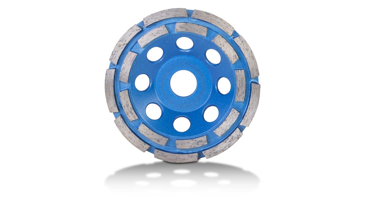 Dvoredni dijamantni lonac za brušenje omogućuje grubo brušenje površina i brušenje rubova u betonu. Stupanj hrapavosti koji ostavljaju ovi lonci za mljevenje je visok, a radna brzina je veća nego u standardnom loncu za brušenja, zahvaljujući dvostrukom redu dijamantnih segmenata.
